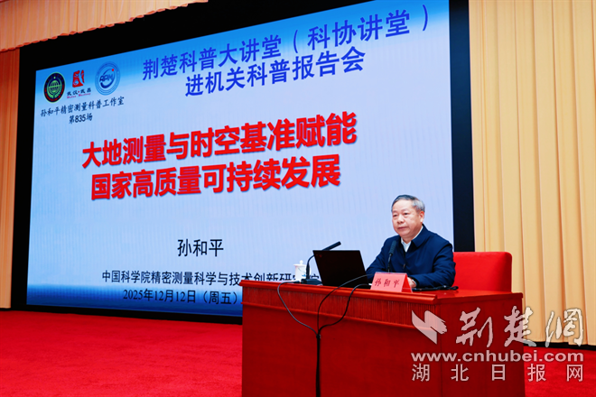 荊楚網(wǎng)(湖北日?qǐng)?bào)網(wǎng))訊(記者陳雅俊 通訊員高笛)12月12日,2025年第四期荊楚科普大講堂(科協(xié)講堂)院士進(jìn)機(jī)關(guān)科普?qǐng)?bào)告會(huì)在武漢舉辦。本次活動(dòng)特邀我國(guó)大地測(cè)量與地球物理領(lǐng)域的權(quán)威專家、中國(guó)科學(xué)院院士孫和平以《大地測(cè)量與時(shí)空基準(zhǔn)賦能國(guó)家高質(zhì)量可持續(xù)發(fā)展》為題作科普?qǐng)?bào)告。